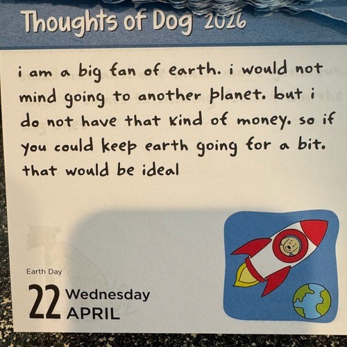 Good afternoon friends! Earler this week we celebrated Earth Day and as Scout and I walked several times that day, I gave thanks for this beautiful world that we all share. That morning, one of our page a day calendars had this reminder of one dog's thoughts on Earth Day. A cute and simple but profound reminder of all of our responsibilities towards being stewards of this planet.